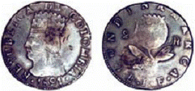 Se encuentra en la moneda de la Junta Patriótica de Cartagena (imagen 4), del mismo año5, y en la Constitución del Estado de Cartagena de Indias (imagen 5) 6. En este caso, la india tiene unas cadenas rotas en la mano izquierda y con la derecha sostiene una granada, de la que se alimenta un ave; al fondo aparecen dos cerros: el de la izquierda con una casa pequeña y un árbol, y el de la derecha con una iglesia -identificado con el cerro de la Popa 7-.