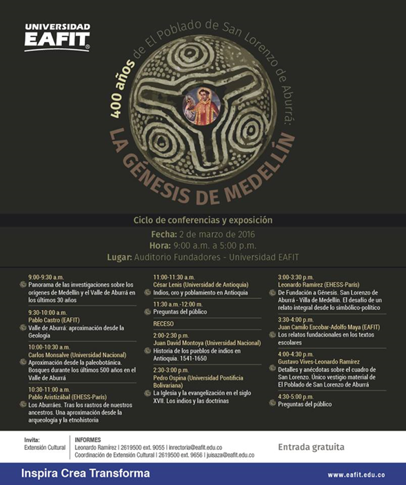 PROGRAMACIÓN DEL EVENTO8:00 A. M.- 8:30 A. M.Presentación del evento 8:30 A. M. - 9:10 A. M.“POBLAMIENTO INDÍGENA EN EL VALLE DE ABURRÁ ANTES DE LA LLEGADA DE LOS ESPAÑOLES”NEYLA CASTILLO ESPITIA:Antropóloga de la Universidad Nacional de Colombia sede Bogotá; magister Universidad Santiago de Compostela, profesora jubilada del Departamento de Antropología de la Universidad de Antioquia. 9:10 A. M. - 9:50 A. M.“LAS VISITAS A LA TIERRA Y LAS VOCES INDÍGENAS”GREGORIO SALDARRIAGA:Doctor en Historia del Colegio de México, Historiador de la Universidad Nacional de Colombia sede Medellín, Profesor Universidad de Antioquia. RECESO 9:50 A. M. - 10:00 A. M.10:00 A. M. - 10:40 A. M.“LOS 30 PRIMEROS AÑOS DE MEDELLÍN”GERMÁN SUÁREZ ESCUDERO:Historiador de Medellín, miembro de la Academia Antioqueña de Historia y de la Sociedad Bolivariana de Antioquia. Geógrafo y cartógrafo, miembro de la Nacional Geographic Society, de The American Geographical Society y del Círculo de Periodistas y Comunicadores Sociales de Antioquia CIPA. 10:40 A. M. - 11:20 A. M.LA CREACIÓN DEL POBLADO DE SAN LORENZO EN EL CONTEXTO DE LAS VISITAS DE LA TIERRA EN LA AUDIENCIA DE SANTA FELUIS MIGUEL CÓRDOBA OCHOA.Doctor en Historia Moderna Universidad Pablo de Olavide Sevilla, Licenciado en Ciencias Sociales de la Educación, Magister en Historia de la Universidad Nacional de Colombia y profesor asociado del Departamento de Historia de la Universidad Nacional de Colombia sede Medellín. 11:20 A. M. - 12:00 A. M.INTERVENCIÓN DE REPRESENTANTES INDÍGENAS PERTENECIENTES AL CABILDO CHIBCARIWAK
