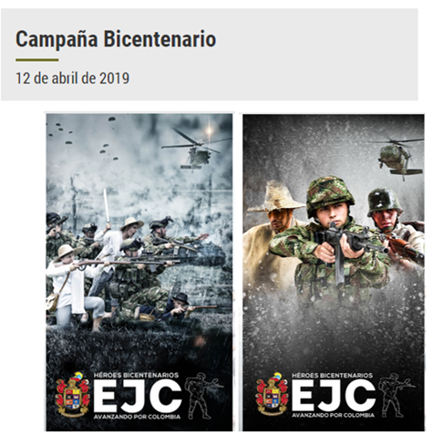 “Son 200 años en los que Colombia ha necesitado de todo nuestro apoyo, compromiso, fuerza, honor y disciplina. Son 200 años en los que cada colombiano ha confiado en la valentía de nuestros soldados de tropa terrestre y aérea. 200 años que continúan marcando el sendero por la paz, la honestidad, la gloria y la fe contundente por un mejor país. Es momento de decirle a Colombia, aquí estamos y continuaremos avanzando por nuestras tierras, nuestros océanos, nuestros ríos y cielos. Siempre protegiendo los sueños de cada uno de los colombianos. Para esto, hemos diseñado el nuevo logo-símbolo que durante el año 2019 identificará nuestra gran Campaña: HÉROES BICENTENARIOS EJC AVANZANDO POR COLOMBIA. Un logo-símbolo basado en la imagen de un soldado fuerte y victorioso del Ejército Nacional. Un soldado que nunca detiene su marcha, y que avanza con pasos firmes para alcanzar la victoria de su nación. Mientras una de sus manos sostiene el arma que protege y blinda a su país, la otra señala con fuerza y decisión el camino que se va seguir. Siempre mirando hacia adelante. Siempre llevando el liderazgo. Siempre avanzando en nuevas tecnologías e innovación. Siempre atento al progreso y la defensa. Siempre transformándose por su familia, su Institución y su país.