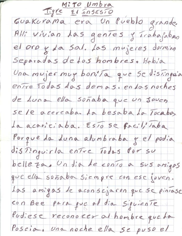 MITO UMBRA DEL TIGRE O DEL INCESTO Texto en lengua Umbra o Unga Este texto se publica, en primer lugar, por su gran valor cultural y como evidencia de la existencia de la lengua Umbra para que pueda servir de insumo para su estudio científico; pero también para reconocer los esfuerzos invertidos desde 1990 por Merardo Largo Trejos, primer gobernador del Resguardo Indígena de Escopetera Pirza, retomados actualmente por su hermano Yoany, para el reconocimiento de esta antigua lengua.