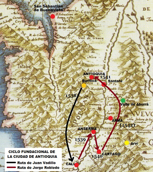 En junio llegaron los españoles hasta el cerro de Buriticá, donde Vadillo confirmó la existencia del yacimiento aurífero, al que no dudó en calificar como “las mejores minas que hasta ahora se han visto en Indias” (Nota 5). El licenciado secuestró la familia del cacique y cuando éste se entregó hizo que los esclavos lo quemaran vivo porque no le quiso mostrar las minas de su pueblo (Nota 6). Vadillo no quiso fundar una población en la zona, prefiriendo seguir de largo en busca de tesoros que pudiera saquear sin necesidad de laborarlos, aunque no dejó de sugerirle al rey el modo en que debía procederse para poblar esas minas (Nota 7). En todo caso, desde entonces la certidumbre sobre la existencia de las minas de Buriticá ocupó en los sueños y los cálculos de los soldados españoles que se movían por el occidente del país el lugar que hasta entonces habían tenido los tesoros imaginados de El Dorado, Piru o Birú, Dabaibe, Cuir Cuir y Arví. El 24 de diciembre de 1538, once meses después de haber salido de Urabá, la expedición de los cartageneros arribó a la recién fundada ciudad de Cali, donde estaban acantonadas las tropas que Sebastián de Belalcázar había traído del Perú, y que por entonces estaban al mando de Lorenzo de Aldana, espía de Pizarro. En Cali se desbarató la expedición de Vadillo. Pese a los intentos de éste de convencer a la tropa de devolverse a fundar una ciudad en Buriticá, sus hombres prefirieron pasarse al bando peruano, y además Aldana le impidió el regreso, recriminándole en público por no haber hecho la fundación al tiempo de pasar por el lugar (Nota 8). Aldana expulsó del país a Vadillo y con la información y los hombres de éste planificó la conquista de las tierras ubicadas al norte de Cali, para lo cual encargó al capitán Jorge Robledo fundar una ciudad en la provincia de Anserma, terreno que éste ya conocía por haberlo explorado con Belalcázar en 1536 (Nota 9). Es de suponer que el propio Aldana concibió la nueva ciudad como punta de lanza para acceder a Buriticá. Robledo salió de Cali en abril de 1539, pero cuando iba en el pueblo de los indios de Guarma, acercándose ya a la provincia de Anserma, se encontró de frente con Juan Graciano y Luis Bernal que venían de Cartagena en persecución de Vadillo, por lo que se apresuró a ejecutar el mandato de Aldana. Así, el 15 de agosto fundó la ciudad de Santa Ana de los Caballeros (hoy Anserma, Caldas), en nombre del marqués del Perú, poniéndole como lindero norte las minas de Buriticá: "Y el dicho señor Capitán [Robledo] dijo allí que allí fundaba la dicha ciudad, según dicho es, y con aditamento que si otro mejor sitio hallase, que la pudiese mudar en parte más conveniente, lo cual pasó el día de Nuestra Señora de Agosto; e señaló los términos de la dicha ciudad hasta las minas de Buriticá e por el río arriba hasta la provincia de los Gorrones, e por los lados treinta leguas por cada cabo" (Nota 10).