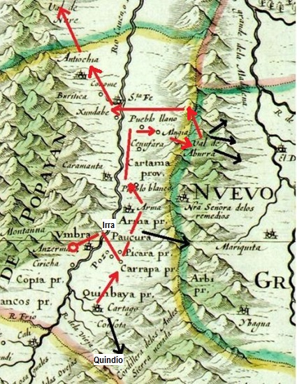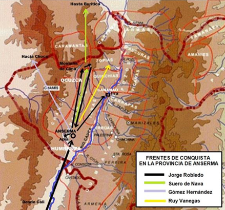 El mismo día que partieron los capitanes cartageneros, Robledo trasladó la ciudad a su asiento actual en la loma de los Umbras (Anserma, Caldas). Desde allí envió tres expediciones a explorar los territorios comarcanos, una hacia el Chocó, otra hacia Pirza y Supía y una tercera por el lado de Caramanta a que desandará el camino de Vadillo, a cargo de Suero de Nava, quien llegó hasta Buriticá y confirmó la existencia de “grandes fundiciones de oro é crisoles é carbón” (Nota 11)